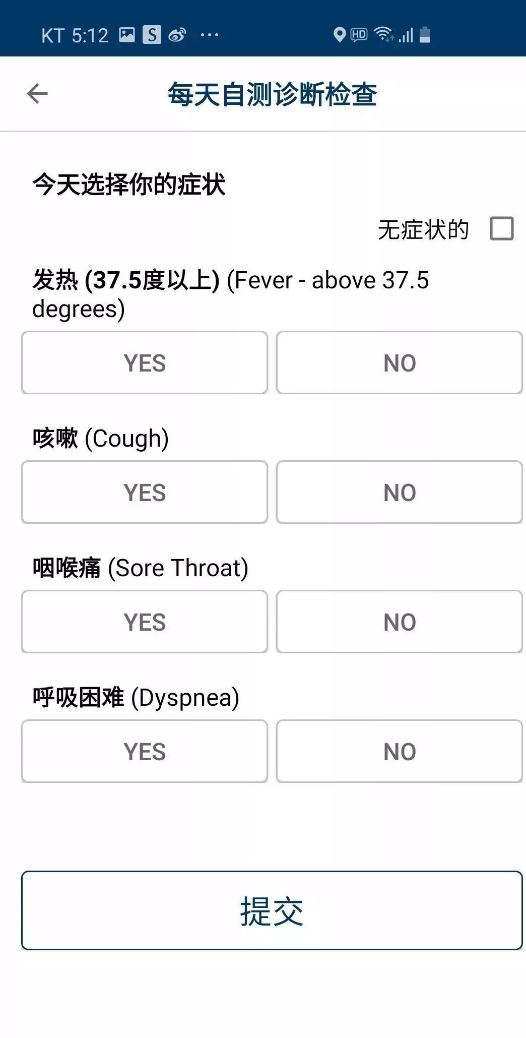 "每日自我诊断检查":由发烧(37.5度以上)和咳嗽、喉咙疼痛、呼吸困难等可确认症状的项目构成。如果在相应项目中出现症状,则有症状(Yes)在选择项目后按下提交按钮,自行诊断结果会自动传送到保健所及疾病管理本部。